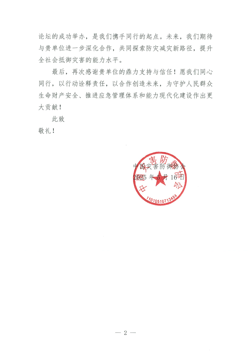 中国灾害防御协会在信中特别指出,此次合作是双方携手同行的新起点。未来,协会期待与我院进一步深化合作,共同探索防灾减灾新路径,推进应急管理体系和能力现代化建设,为守护人民群众生命财产安全凝聚更强合力!