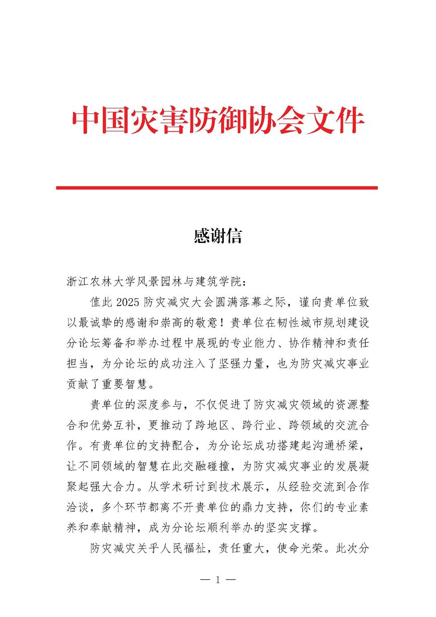 近日,中国灾害防御协会向2003网站太阳集团2138cn太阳集团发来感谢信,对我院在2025防灾减灾大会“韧性城市规划建设分论坛”中的卓越贡献致以诚挚谢意与崇高敬意!